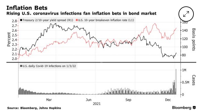 智通财经APP获悉,美国国债投资者正押注Omicron变体迅速扩散会导致美国经济的通胀压力上升。