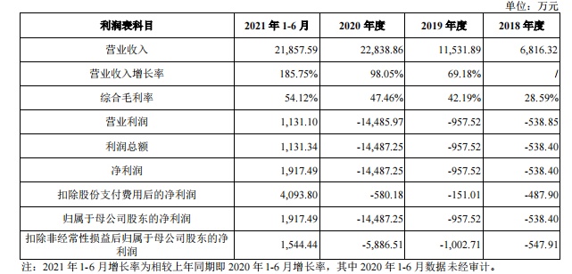 与此同时,公司持续加大研发投入,报告期内扣除股份支付费用后研发费用占营业收入的比例分别达到 20.52%、27.20%、34.70%和26.07%。较高的研发投入,使得公司在收入、毛利持续增长的情况下尚处于亏损状态。2021年上半年,受益于营业收入规模的快速增长、毛利率的持续提升以及规模效应带来的期间费用率下降,公司实现盈利。报告期内,归属于母公司股东的净利润分别为-538.40万元、-957.52万元、-1.45亿元、1017.49万元,2021年上半年实现扭亏为盈,盈利能力显著改善。