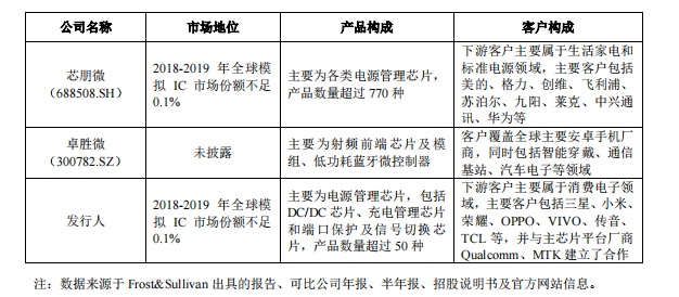 总体而言,希荻微现有产品线聚焦于 DC/DC 芯片、充电管理芯片和端口保护及信号切换芯片领域,产品型号仅数十种,与广泛覆盖各类模拟芯片的 TI、ON Semi、Maxim 等国际龙头厂商相比,公司产品结构较为单一;与矽力杰、圣邦股份等国内模拟芯片供应商相比,公司产品种类仍相对较少。因此,发行人目前产品线尚不完全,存在盈利点单一、抗风险能力较弱的劣势。