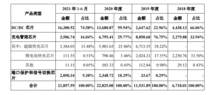招股书显示,希荻微一家半导体和集成电路设计企业,主营业务为包括电源管理芯片、信号链芯片在内的模拟集成电路产品的研发、设计和销售。公司主要产品涵盖DC/DC芯片、超级快充芯片、锂电池快充芯片、端口保护和信号切换芯片等,目前主要应用于手机、笔记本电脑、可穿戴设备等领域。
