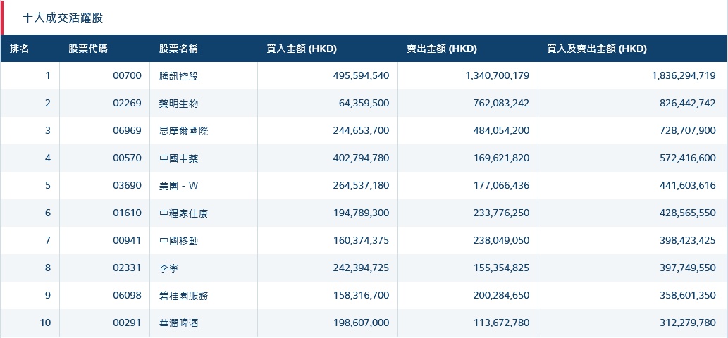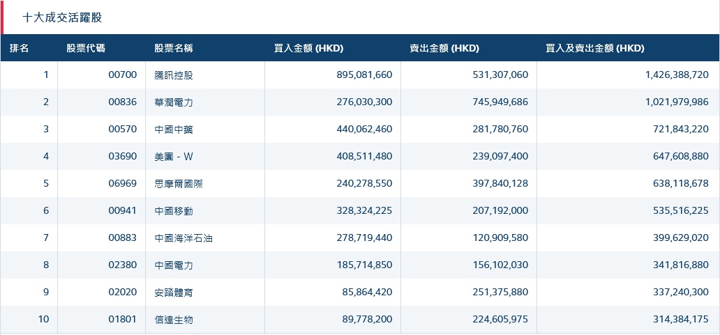此外,中海油(00883)、华润啤酒(00291)、中国电力(02380)分别获净买入1.57亿、8493万、2961万港元。而腾讯(00700)、华润电力(00836)、中粮家佳康(01610)分别遭净卖出4.81亿、4.69亿、3898万港元。