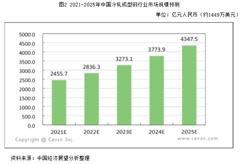 不断增高的行业产能也在推动整个市场规模持续扩大。根据2016-2020年中国冷弯型钢市场规模变化趋势,通过对未来的预测,预计2025年中国冷弯型钢行业市场规模将达到约4347.5亿元,约合630亿美元,复合增长率约为15.5%。
