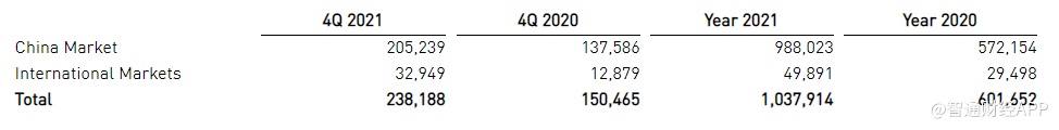 2021年全年总销量为1,037,914辆,同比增长72.5%。 中国市场和国际市场的销量分别达到988023辆和49891辆。