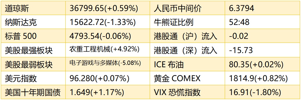 1.隔夜美股道指涨214.59点,涨幅0.59%,报36799.65点;纳指跌210.08点,跌幅1.33%,报15622.72点,创去年12月16日以来最大单日跌幅;标普500指数跌3.02点,跌幅0.06%,报4793.54点。值得注意的是,美元指数创近两周新高,衡量美元兑六种主要货币的一篮子美元指数(DXY)强势反弹站上96关口。港股ADR指数上涨,按比例计算,收报23334点,升44.75点或0.19%。