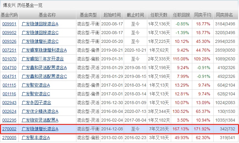 其中,广发稳健增长混合A规模213.42亿元,是他在管5只基金中管理时间最长、规模最大的基金。12月31日,该基金单位净值1.6682元,任职七年来累计净值4.7282元,任职回报167.13%,在同类基金中排名342。