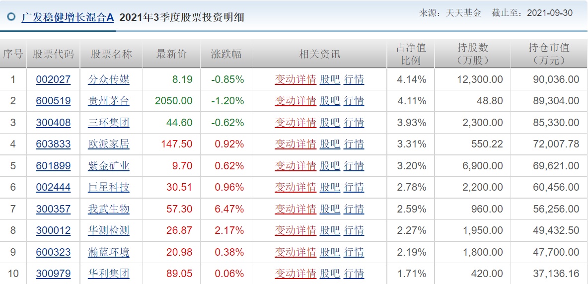 傅友兴的三季度前十大重仓股分别为:分众传媒(002027.SZ)、贵州茅台(600519.SH)、三环集团(300408.SZ)、欧派家居(603833.SH)、紫金矿业(601899.SH)、巨星科技(002444.SZ)、我武生物(300357.SZ)、华测检测(300012.SZ)、瀚蓝环境(600323.SH)、华利集团(300979.SZ)。