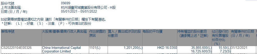 智通财经APP获悉,香港联交所最新资料显示,12月31日,中金公司增持顺丰同城(09699)120.12万股,每股作价16.0350港元,总金额约为1926.12万港元。增持后最新持股数目为3586.56万股,最新持股比例为15.50%。