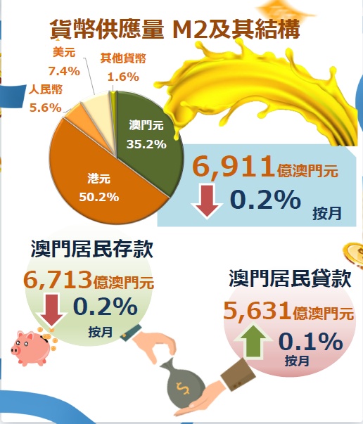 货币供应:流通货币及活期存款分别减少0.6%及1.6%,M1因而较上月下跌1.3%。与此同时,准货币负债下跌0.1%,因此包括M1及准货币负债的广义货币供应量M2遂按月回落0.2%,金额为6,911亿澳门元。若与2020年同期比较,M1及M2分别下跌4.9%及0.3%。按币种分析,澳门元、港元、人民币及美元在M2的比重分别为35.2%、50.2%、5.6%及7.4%。