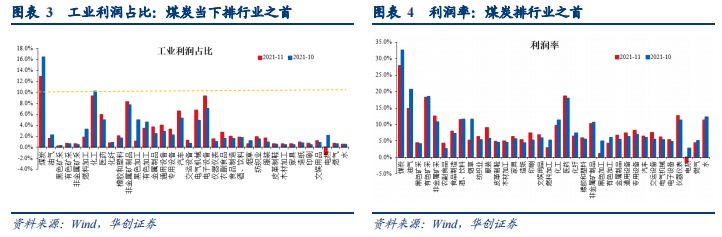 举例而言,虽然近期煤炭价格持续走低,但就数据来看,当下煤炭依然是工业企业中最赚钱的行业。以2021年11月为例,根据华创证券研报,煤炭行业的利润占工业企业总利润的比重为12.9%,为36个细分行业之首;利润率为27.8%,同样位居36个细分行业之首。