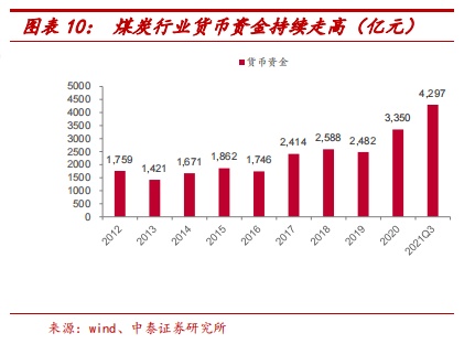 回溯历史,一方面,“十三五”期间政府大力推行的供给侧结构性改革,实现了行业产能快速出清,煤企经营活动产生的现金流入持续走高;另一方面,当前“碳中和”政策对行业新增产能投资形成有效抑制,投资活动产生的现金流出持续走低。这一背景下,截至2021年第三季度末,煤炭行业货币资金达到4297亿元,是2016年末的2.5倍。