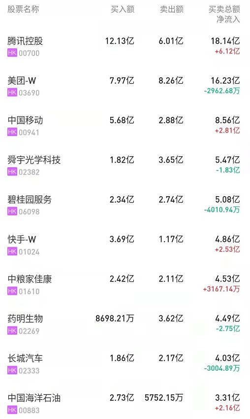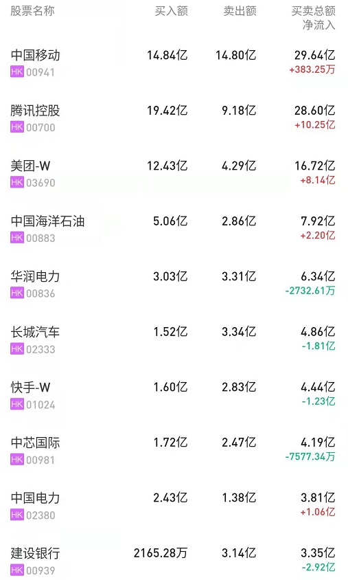 中国移动(00941)获净买入2.84亿港元。消息面上,中国移动宣布,计划回购最多占已发行H股总数的10%。瑞银发表研究报告指,认为此消息属正面惊喜,维持中移动“买入”评级,目标价60港元。瑞银表示,投资者普遍期待如公司回A股上市后,在3月份发表全年业绩时将公布改善股息政策等消息,又预计电信营运商的基本面复苏趋势将会维持多年。预计明年该行业的服务收入和净利润将分别增长7%和9%,稳健的业绩和改善的公司治理应该会重拾投资者对该行业的信心。
