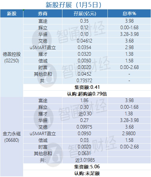智通财经APP获悉,德盈控股(02250)、金力永磁(06680)正在招股中。截至1月5日,富途、辉立、华盛等合计为其分别借出孖展0.73572亿港元、3.01985亿港元,德盈控股超购逾0.79倍,金力永磁认购未足额。