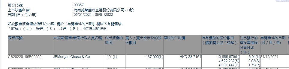 智通财经APP获悉,香港联交所最新资料显示,12月31日,小摩增持美兰空港(00357)18.7万股,每股作价23.7161港元,总金额约为443.49万港元。增持后最新持股数目为1365.5679万股,最新持股比例为6.01%。