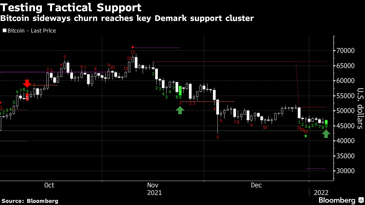 不过,比特币近期的颓势可能会逆转,其价格可能即将再度上涨。比特币过去30天的历史波动率是自去年9月以来的最低水平,而且其价格已经显示出短期的枯竭信号。所谓的Demark序列指标显示,在43,295美元至44,500美元的支撑位上方,出现了一种“9-13-9”模式;而这一支撑位则是比特币在去年6-11月的那波涨势中所形成的。