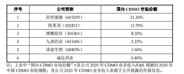尽管报告期内业绩亮眼,但从市场占有率来看,诚达药业两大主营业务均不算突出。数据显示,2020年诚达药业CDMO市场份额仅有0.80%,而招股书所列举的药明康德、凯莱英、博腾股份和九洲药业等4家同行业上市公司的CDMO市场份额分别为21.30%、12.70%、8.2%和5.22%,均高于诚达药业。