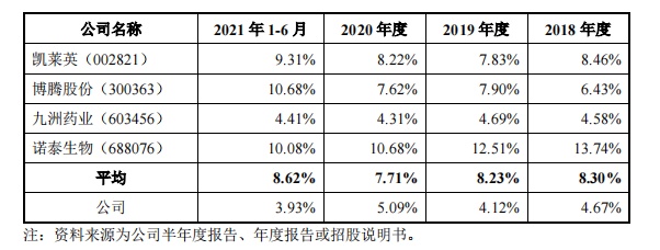 更为重要的是,本就在规模上落后的诚达药业,在研发支出方面也明显低于同行。2018-2021年上半年,公司的研发费用率分别为4.67%、4.67%、4.12%、5.09%及3.93%,同行均值分别为8.30%、8.23%、7.71%及8.62%,研发费用率低于同行均值。