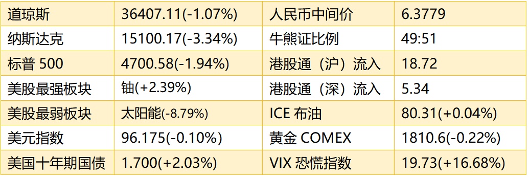 1.隔夜美股由于美联储会议纪要偏向收紧货币政策,纳指跌超3%,标普跌近2%,道指跌逾1%;大型科技股普跌,特斯拉跌逾5%,热门中概股多数下跌。港股ADR指数下跌,按比例计算,收报22902点,跌4.61点或0.02%。