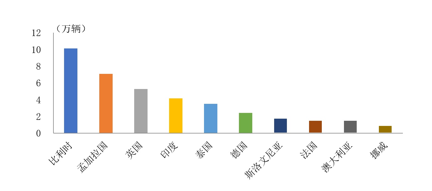 智通财经APP获悉,据中国汽车工业协会整理的海关汽车商品出口数据显示,2021年1-11月,中国新能源汽车出口排名前十位国家依次是比利时、孟加拉国、英国、印度、泰国、德国、斯洛文尼亚、法国、澳大利亚和挪威。与上年同期相比,上述十国新能源汽车出口量呈不同程度增长,其中斯洛文尼亚、澳大利亚和泰国增速更为显著。2021年1-11月,上述十国累计出口新能源汽车38.8万辆,占新能源汽车出口总量的78%。