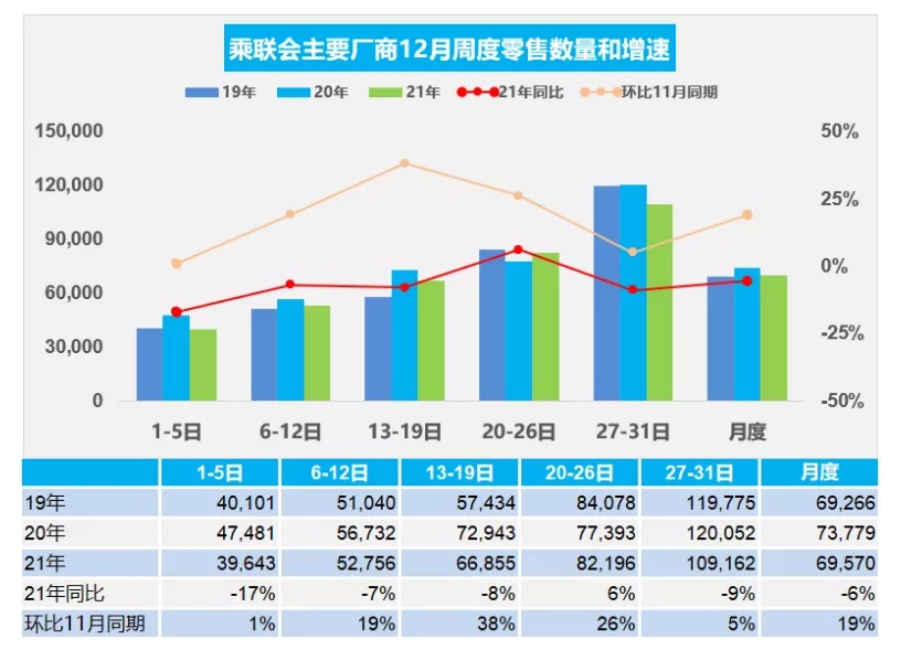 智通财经APP获悉,据乘联会数据显示,2021年12月第五周狭义乘用车全口径日均批发10.2万辆,同比下降17%,相对于11月同期下降16%,走势相对平稳。乘联会内部初步统计,12月的总体零售数据达到215.7万辆,日均6.9万辆,同比下降6%,环比增长19%。由于2021年10至11月的生产改善明显,12月的零售回升也应该较明显,但目前的回升速度还是不快,但与2019年的状态相近,也是较好的表现。