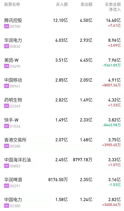 北水净买入最多的个股是腾讯(00700)、美团-W(03690)、药明生物(02269)。北水净卖出最多的个股是华润电力(00836)、中国电力(02380)、华润啤酒(00291)。