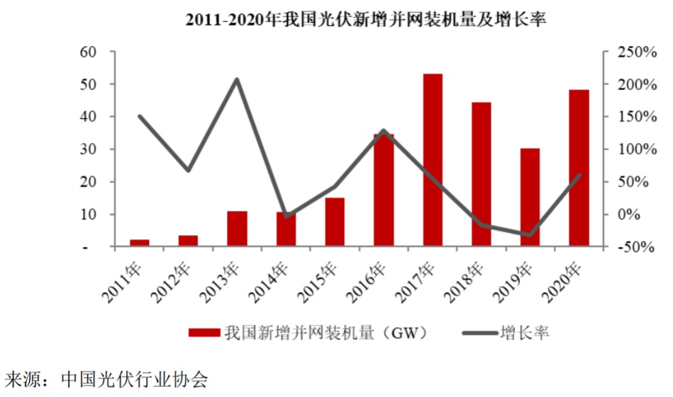 此外,根据IHS Markit、BNEF以及中国光伏行业协会的预测,2021年我国新增装机将达到55GW至65GW之间,相较于2020年仍然有较大的涨幅。