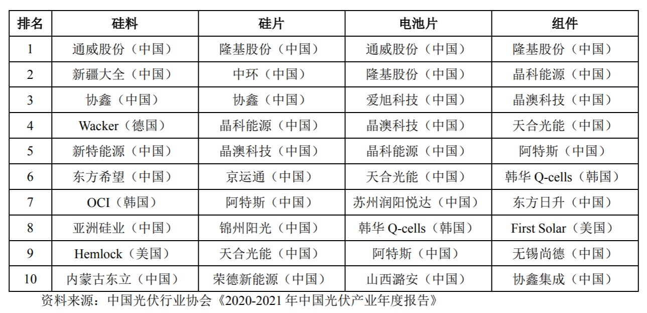 得益于整个行业的良好发展,行业内的企业也得以继续巩固在全球的规模领先优势,在硅料、硅片、电池片以及组件四个环节中,排名前十的企业中,中国的企业占据了大部分的席位,在其中的三个环节中也看到了阿特斯的身影。