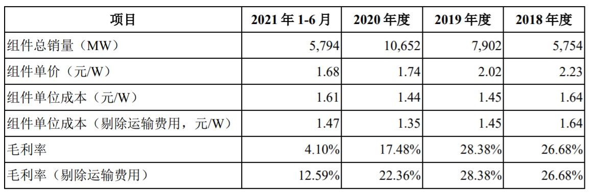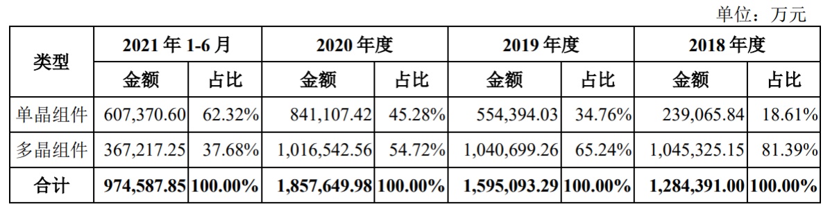 从阿斯特业务结构来看,公司单晶组件销售占比自2018年以来呈逐年增长趋势,但行至2021年上半年,单晶组件销售占比仅为62.32%。