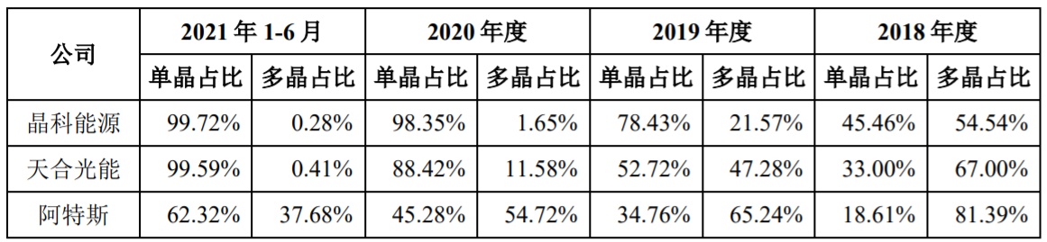 横向对比来看,阿斯特主要竞争对手,晶科能源以及天合光能在2020年度的单晶组件收入占比已经分别达到98.35以及88.42%,今年前六个月更是增长至99.72%以及99.59%。
