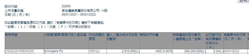 智通财经APP获悉,香港联交所最新资料显示,1月4日,Schroders PLC增持紫金矿业(02899)291万股,每股作价9.0878港元,总金额约为2644.55万港元。增持后最新持股数目约为2.89亿股,最新持股比例为5.04%。