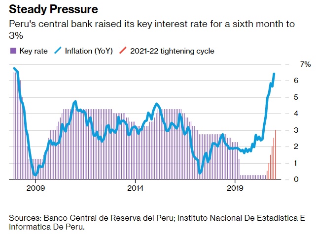 在秘鲁,由于食品和能源价格上涨,12月份的年通货膨胀率达到了13年来的最高点6.4%。秘鲁央行的通胀目标为2%,上下浮动一个百分点。