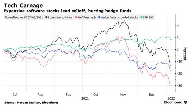 新年伊始,这些基金经理的情绪受到新的打击,因为他们最喜欢的头寸出现了偏差。摩根士丹利策略师表示,由于净杠杆率较近期历史水平处于70%左右,该行业的整体股票敞口可能需要下降,因美联储开始转向强硬立场,而缓解利率焦虑的唯一潜在解药——财报仍需数周时间。