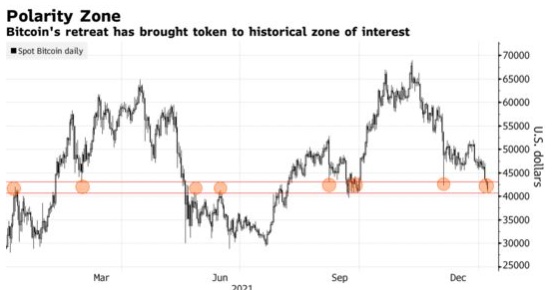 关注反转“利益区”的区域。所谓的反转“利益区”的区域是4.06万至4.3万美元;在“利益区”中,先前的阻力位会变成支撑线,反之亦然。在过去的12个月里,比特币在这个区域多次显应。若比特币跌破4.06万美元将意味着进一步走软。