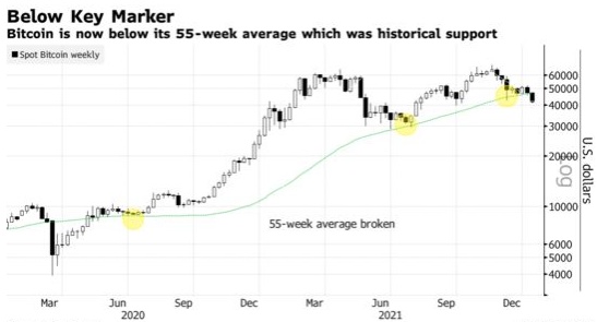 其次,在过去两年,比特币的每次下跌均在55周的简单移动平均线获得支撑,该支撑水平目前约为4.6万美元。在4月至6月的熊市中,比特币价格即使下跌了56%,但仍位于该支撑水平上方;12月初的闪电崩盘也是如此。比特币持续的下滑已将价格推至这一关键平均水平以下。