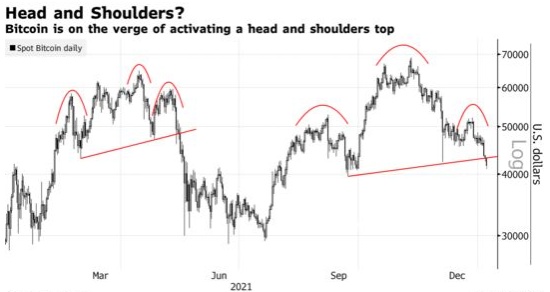 再者,随着周五的下跌,所谓的“头肩顶”型态可能已经被激活,头肩排列是常见的反转型态。2月至5月期间也出现了类似的情况,比特币从近6.5万美元跌至2.88万美元。比特币目前已经打破了关键关口——如果比特币进一步受压,在40600美元的位置失去反转支持,那么会进一步下跌。