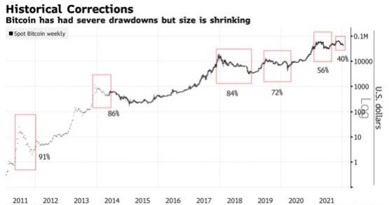 此外,在过去十年中,包括这周的下跌,比特币经历了六次大幅回调。每一次的降幅都小于前一次。以2021年比特币价格56%的跌幅为例,市场投资人士应关注3万美元这个关键水平,该水平相较于去年约6.9万美元的记录高点回落56%。