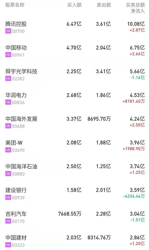 北水净买入最多的个股是腾讯(00700)、中国移动(00941)、美团-W(03690)。北水净卖出最多的个股是华润电力(00836)、舜宇光学(02382)、中国电力(02380)。