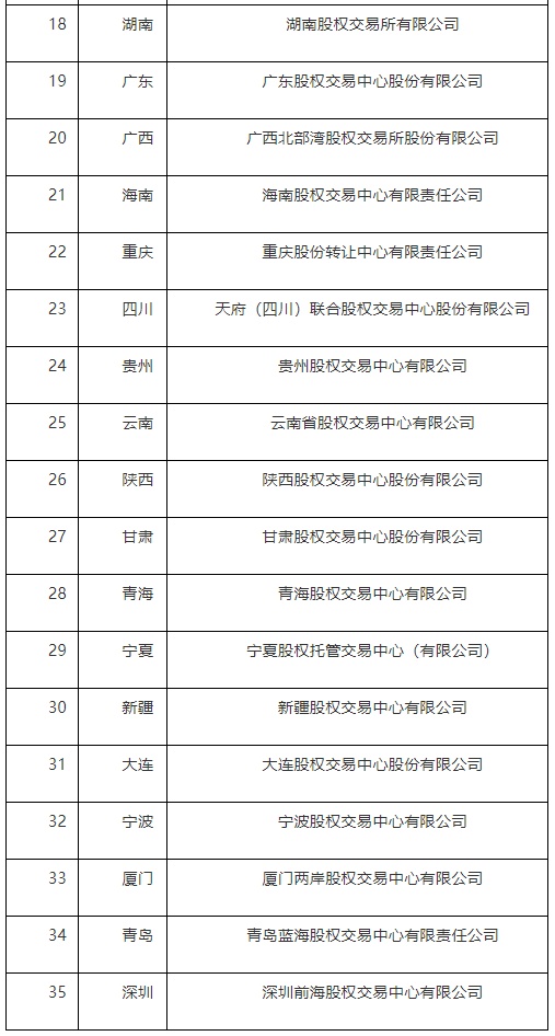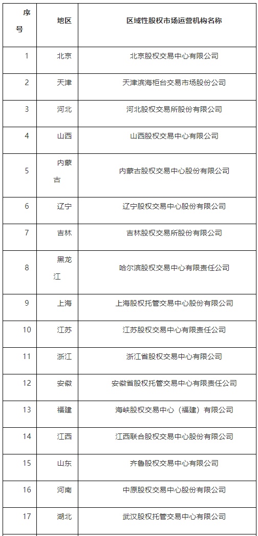 智通财经APP获悉,1月7日,证监会公示全国区域性股权市场运营机构备案名单。根据《国务院办公厅关于规范发展区域性股权市场的通知》《区域性股权市场监督管理试行办法》有关规定,区域性股权市场运营机构名单由省级人民政府实施管理并予以公告,同时向证监会备案。现将向证监会备案的35家区域性股权市场运营机构名单公示如下: