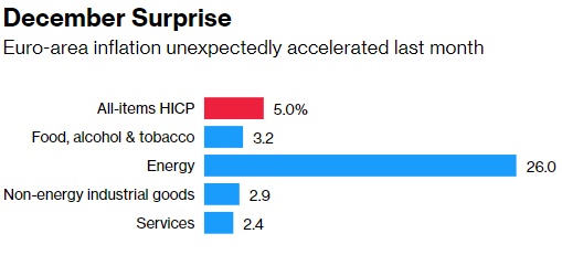 数据显示,能源价格同比上涨26%,仍是12月总体价格上涨的主要推动因素,但食品、服务和进口商品价格的涨幅也远高于欧洲央行2%的总体通胀目标。