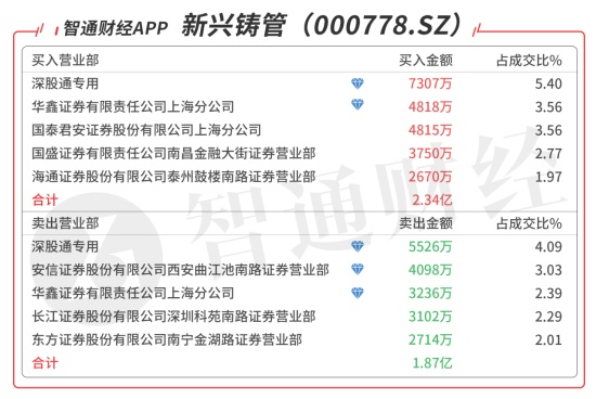 新兴铸管(000778.SZ):多主力现身龙虎榜,深股通对倒净买入1780万元,买二是知名游资的席位对倒净买入1581万元,买三是知名游资的席位买入4815万元,当日净买入4521万元,该股近期持续放量,今日强势涨停,预计压力位在5.6附近。