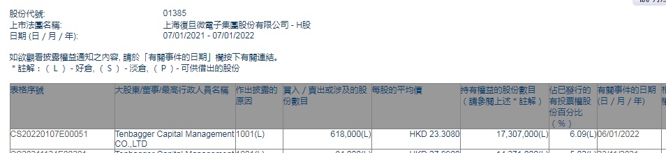 智通财经APP获悉,香港联交所最新资料显示,1月6日,Tenbagger Capital Management CO.,LTD 增持上海复旦(01385)61.8万股,每股作价23.3080港元,总金额约为1440.43万港元。增持后最新持股数目为1730.70万股,最新持股比例为6.09%。