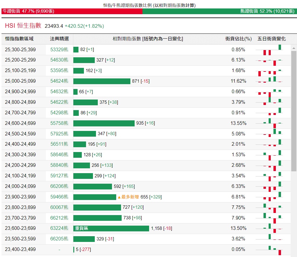 法兴恒指牛熊证街货分布图中的数据显示,熊证街货重货区在23600-23699区间,该区间最新熊证数量为1158张,较上一交易日减少18张;最多新增在23900-23999区间,该区间最新熊证数量为655张,较上一交易日增加329张。