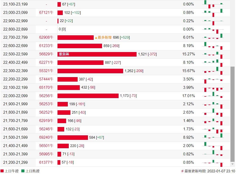 牛证街货重货区在22500-22599区间,该区间最新牛证数量为1521张,较上一交易日减少372张;最多新增在22700-22799区间,该区间最新牛证数量为696张,较上一交易日增加529张。