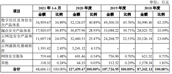 公司主营业务分为以下四大产品服务体系:一是以泛身份安全类产品和数据安全类产品为主体的数字信任及身份安全产品体系;二是以泛终端安全类产品、云及边缘安全类产品、高级威胁治理类产品和边界安全类产品为典型的端点安全产品体系;三是以大数据分析及安全管理类产品和 5G 云网边管理类产品为代表的云网边安全产品体系;四是以威胁情报、高级威胁研究、红蓝对抗、攻防渗透等为内容的网络安全服务体系。