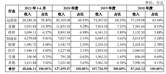 从下游的终端应用领域来看,亚信安全业务遍布运营商、金融、政府、制造业等诸多行业。其中公司的主要收入来源为电信运营商行业。根据 Frost&Sullivan 研究报告,2019 年亚信安全在中国网络安全电信行业细分市场份额中排名第一。于报告期内,来自该行业的收入分别为5.72亿元、7.36亿元、8.53亿元和2.84亿元,占比分别为 65.44%、68.29%、66.93%和 58.40%。