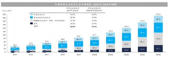 伴随中国企业数字化转型的推进,政府和企业信息化建设中网络安全投入的驱动力已经不仅仅局限于政策合规,而是更多的体现在业务发展过程中的内在需求。同时,政府和企业级用户的预算投资也正在更多的向软件和服务市场迁移,中国网络安全软件市场发展增速明显。预计在 2024 年,中国网络安全软件市场规模将达到 211.6 亿元,2020 年至 2024 年期间年复合增长率将达到 23.2%。