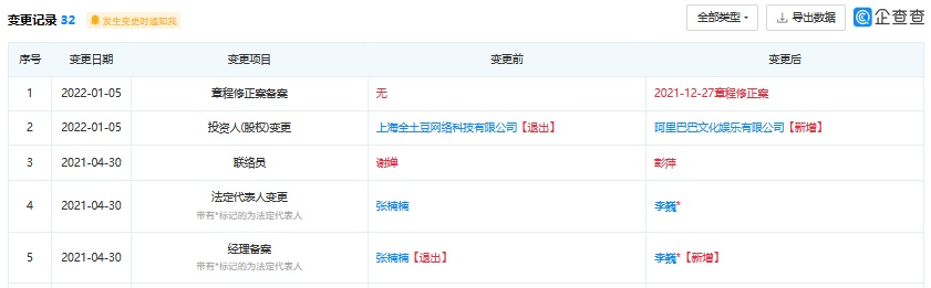 智通财经APP获悉,企查查APP显示,上海合享文化传播有限公司日前发生工商变更,上海全土豆网络科技有限公司从股东中退出,新增股东巴巴有限公司,持股100%,法定代表人从“张楠楠”变更为“李巍”。据公开资料显示,上海合享文化传播有限公司成立于2009年6月,经营范围包括文化艺术交流策划,经营演出及经纪业务,计算机系统服务等。