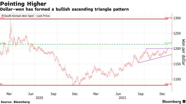 上周,美元兑韩元汇率突破了2021年的最高值1200.35、达到了1203.90,而下一个关键水平将在1214.09附近。此外,技术指标还显示,美元兑韩元汇率形成了一个看涨的上升三角。