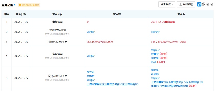 智通财经APP获悉,企查查APP显示,1月5日,上海济达交通科技有限公司发生工商变更,新增股东阿里巴巴(中国)网络技术有限公司。据公开资料显示,济达交通成立于2019年11月,是一家交通仿真领域的技术公司,主打产品为国产TESS NG微观交通仿真软件。公司致力于引领微观交通仿真行业技术发展及工程价值应用。