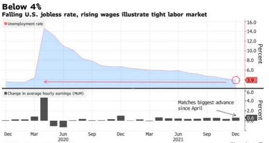 美国12月失业率为3.9%,续刷2020年2月来新低,预期值4.1%,前值4.2%。工资上涨,美国12月平均每小时工资年率达4.7%,预期4.2%,前值4.8%。这进一步证明劳动力市场吃紧,可能给通胀带来进一步上涨的压力。