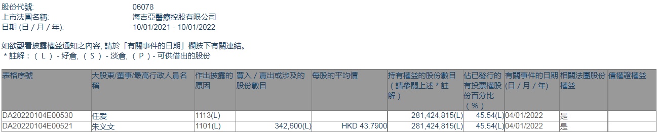 智通财经APP获悉,香港联交所最新资料显示,1月4日,公司主席朱义文增持海吉亚医疗(06078)34.26万股,每股作价43.79港元,总金额约为1500.25万港元。增持后最新持股数目为2.81亿股,最新持股比例为45.54%。